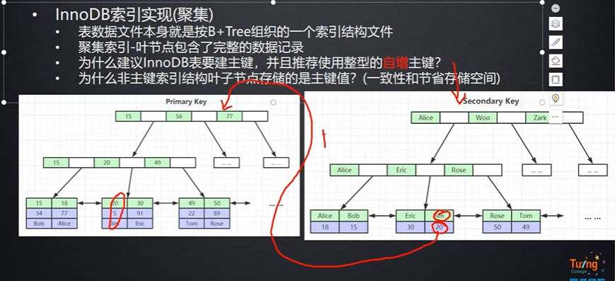 innodb的主键索引存储方式是B+树,而非主键索引的存储结构是叶子结点放主键索引的主键,如下图的例子,如果要找Jim,通过一段比大小后,找到的是主键的主键字段值,再回到idb文件里去找到对应的表内容