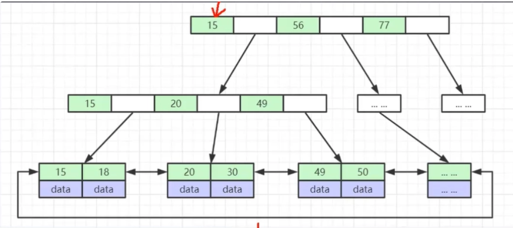 我们对之前的B+tree做一个补充说明,叶结点之间互相是有一个双向指针的,所以当我们找到了一个元素,其实是可以跟着这个双向指针,一路顺下去的
